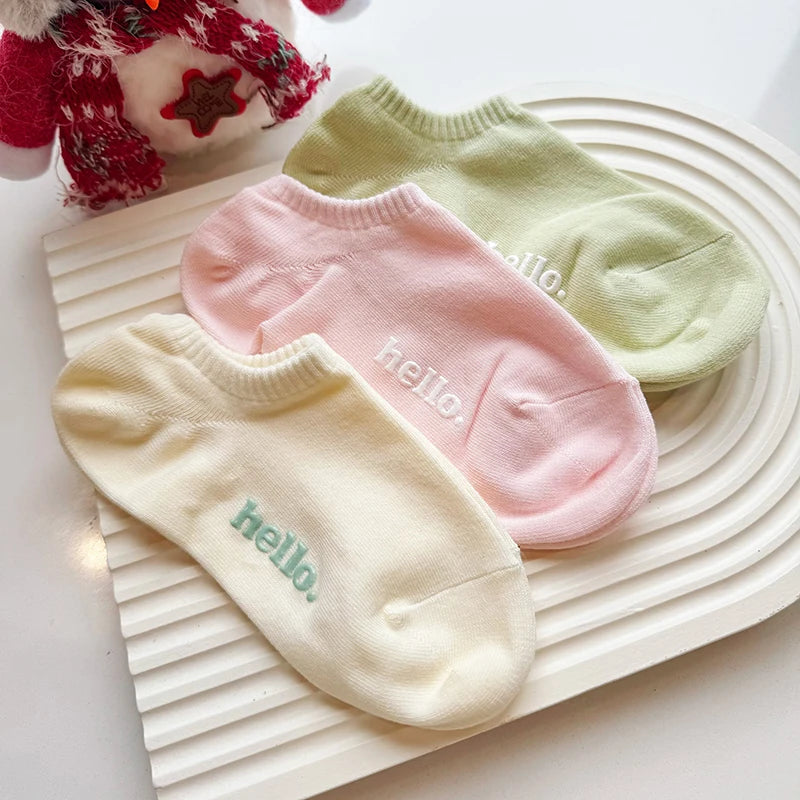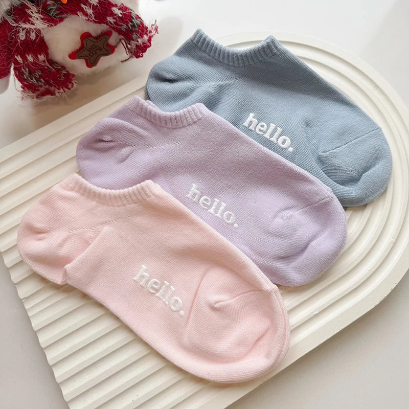 Start your day on the cutest note with this trio of pastel low-cut socks, embroidered with a soft “hello.” greeting. Crafted from a breathable cotton blend,...
