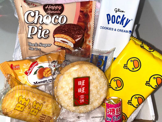Try our box of assorted asian snacks. Each box will include seven individually wrapped items. Delivers do the US only The box will include:1) Black sugar milk...
