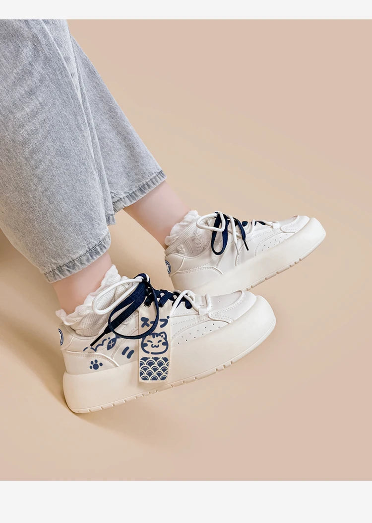 Step into charm with our Lucky Neko Sneakers — a clean, kawaii blend of playful energy and Japanese street-style vibes. Featuring a cheeky cat tag and subtle paw print motifs, these lace-ups are comfy, cute and easy to pair with casual fits. The mix of white and navy makes them pop without trying too hard!