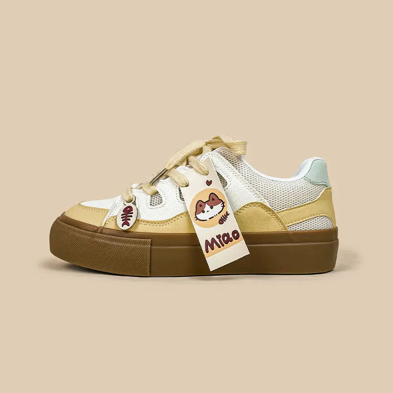 Soft colors, comfy steps, and a dash of feline charm. The Mitao Cream Sneakers bring together creamy beige tones, golden yellow accents and a playful cat fishbone tag for a look that’s both cozy and cute. With breathable mesh panels and a cushioned insole, they’re made for relaxed fits and warm-weather strolls.