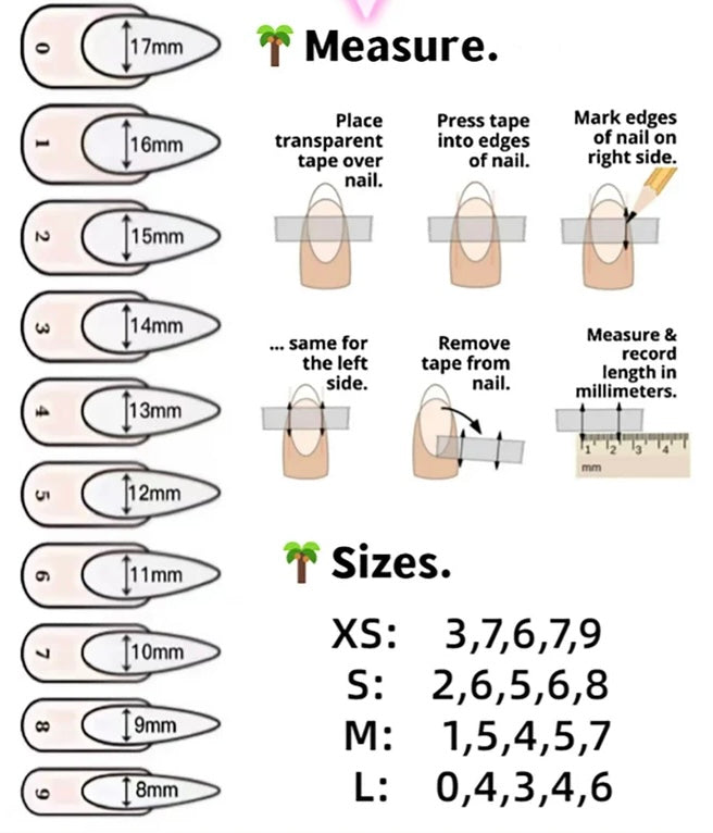 Please measure your own nail and find your size from our picture guide.