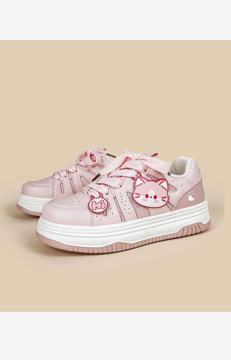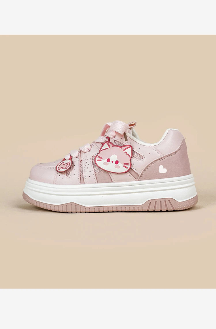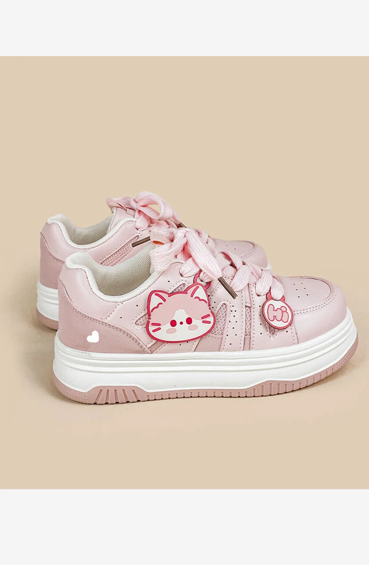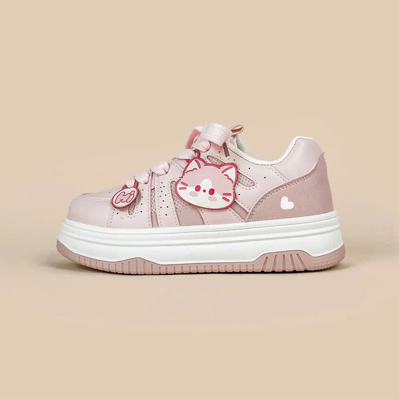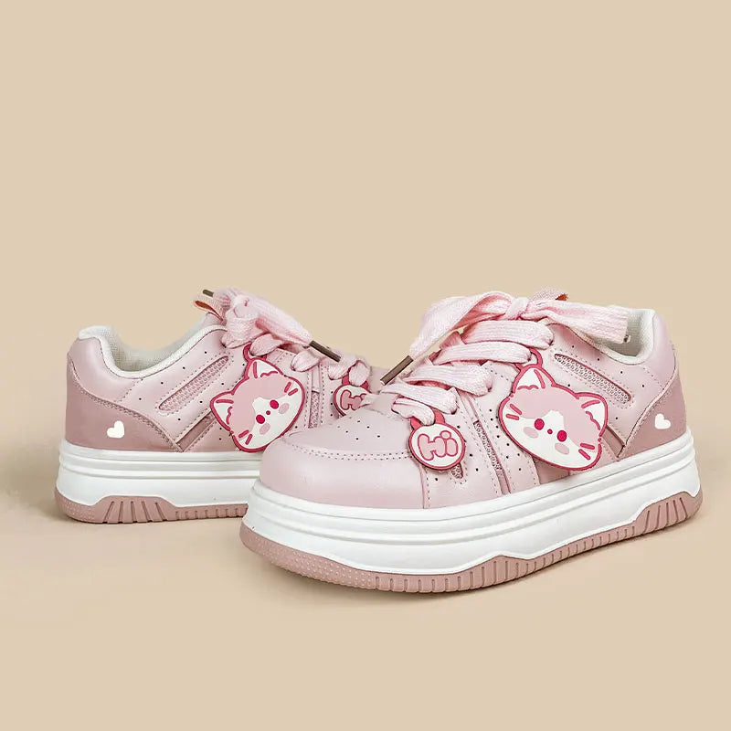 Add some adorable attitude to your step with these pastel pink sneakers featuring a kawaii cat charm and subtle heart details. Made with a smooth microfiber upper and breathable cotton lining, these cuties keep you comfy all day. The soft latex insole gives your feet a cushiony hug, while the durable rubber sole supports everyday wear.