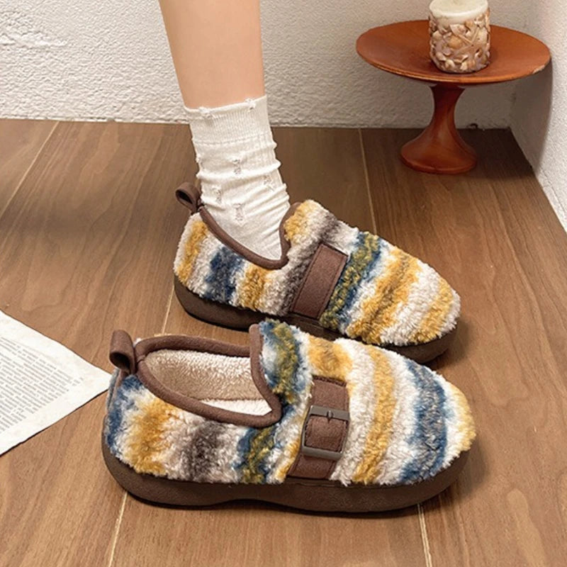 These checkered cotton slippers feature a distinctive brown and cream plaid pattern that adds style to your everyday comfort. The plush fuzzy lining provides gentle warmth, while the adjustable buckle strap ensures a secure fit.