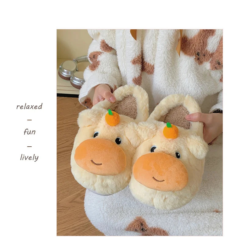 Step into comfort with the sweetest slippers ever. The Peachy Moo Plush Slippers keep your feet warm, cozy, and smiling all at the same time. With their soft cream fur, chubby orange snouts, and tiny peach toppers, they feel like little friends hugging your feet.