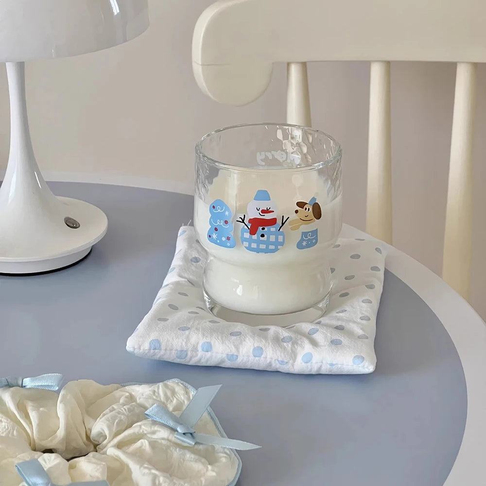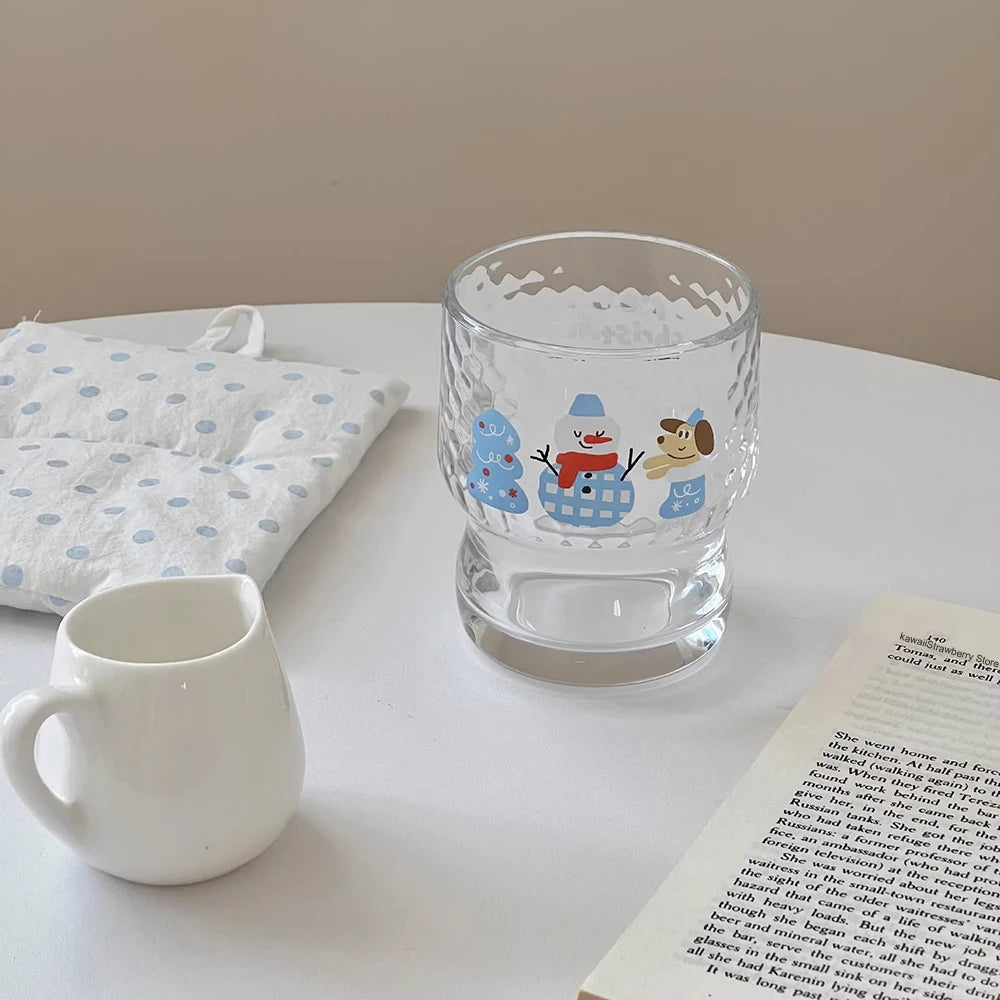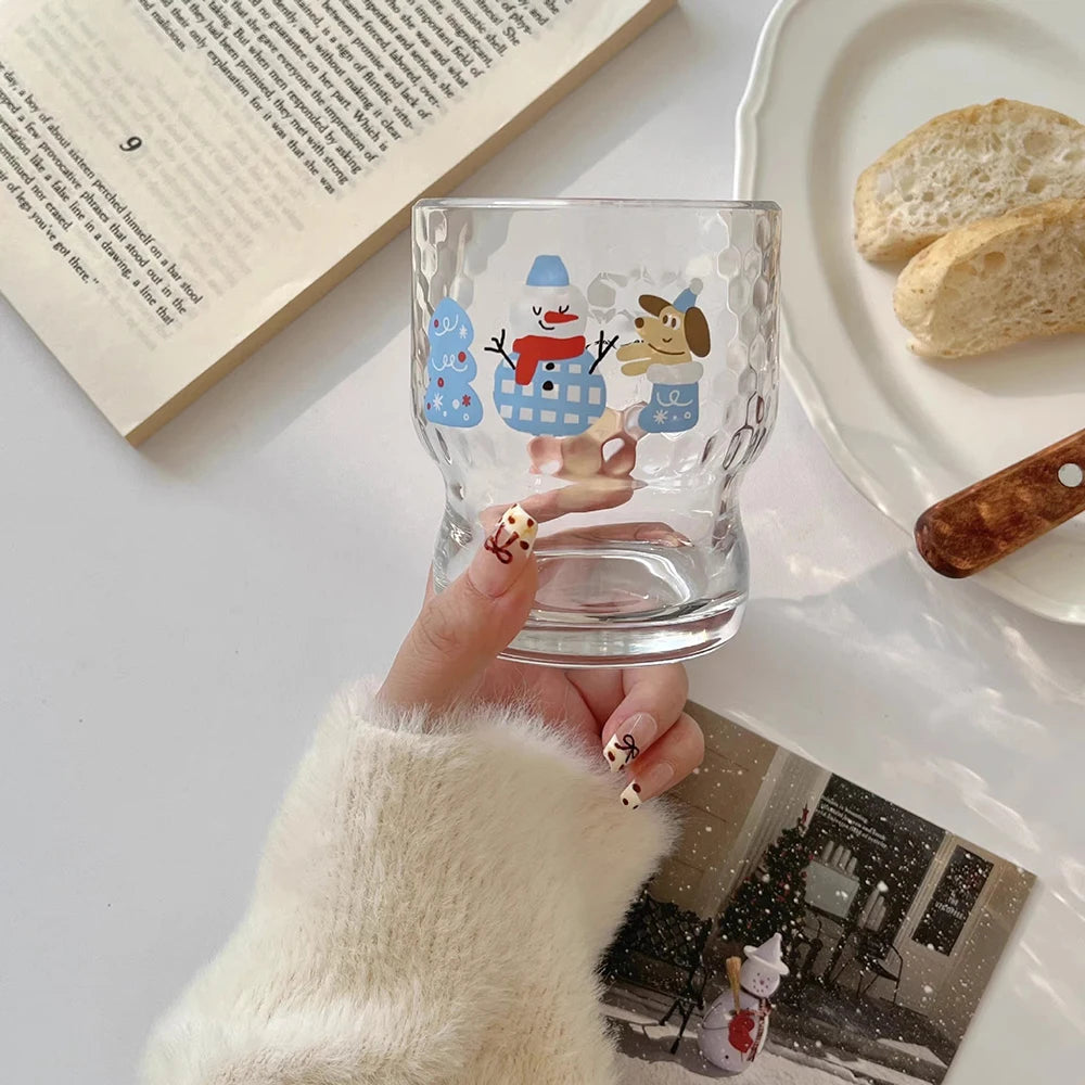 The happiest trio—snowman, cookie tree, and pup—wrapped around a clear glass cup, perfect for hot drinks, cold brews, or snowy-day snacks.