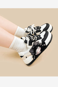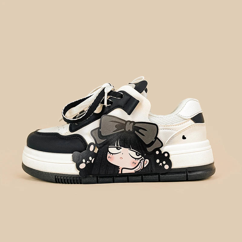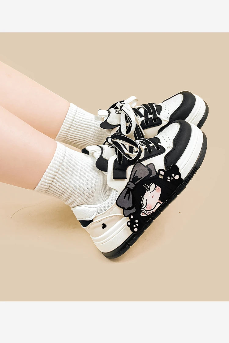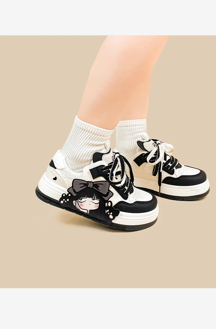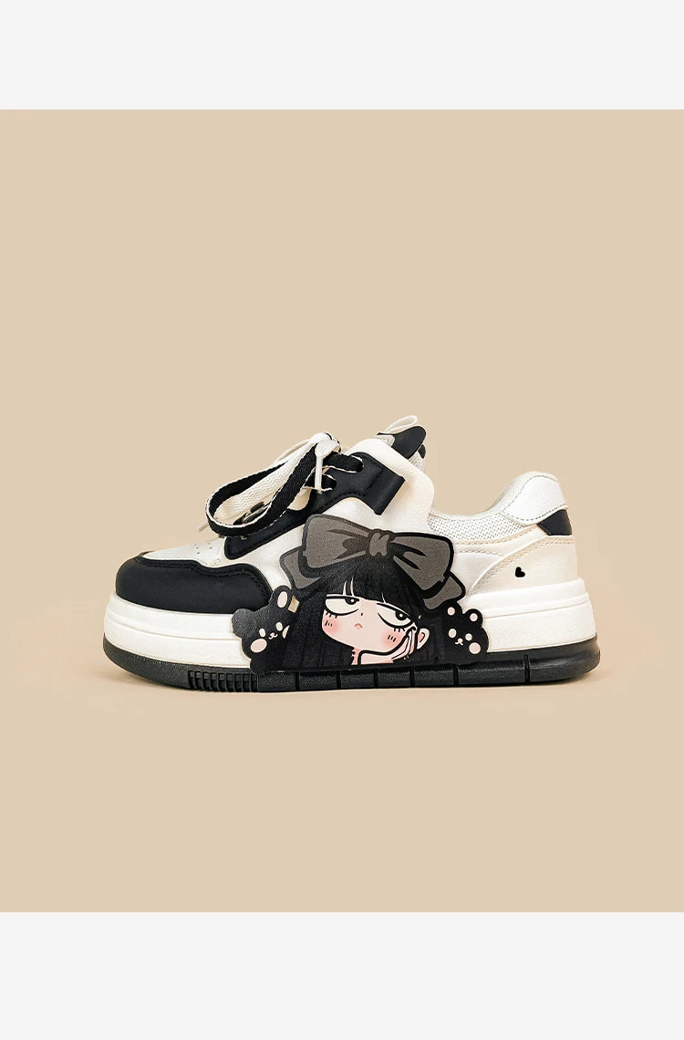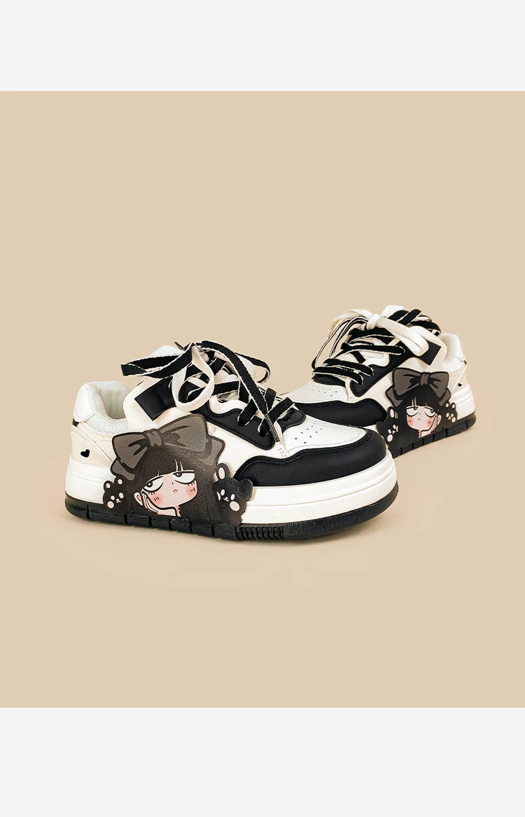 Bold, edgy, and unapologetically cute — Midnight Moods brings anime aesthetics to everyday streetwear. Designed with a sleek black and ivory palette, these lace-up sneakers are soft on the feet and fierce on the outside. The latex insole keeps you supported, while the classic low-cut shape lets you pair them with anything from mini skirts to wide leg jeans. Perfect for those who love kawaii with a touch of rebellion.