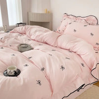 Soft, minimal and irresistibly sweet the Ribbon Whispers bedding set features delicate black bow embroidery on a pastel canvas, finished with ruffled edges for a touch of French girl charm. Made from soft, breathable polyester with an elegant twill weave, this set turns your room into a dreamy haven.