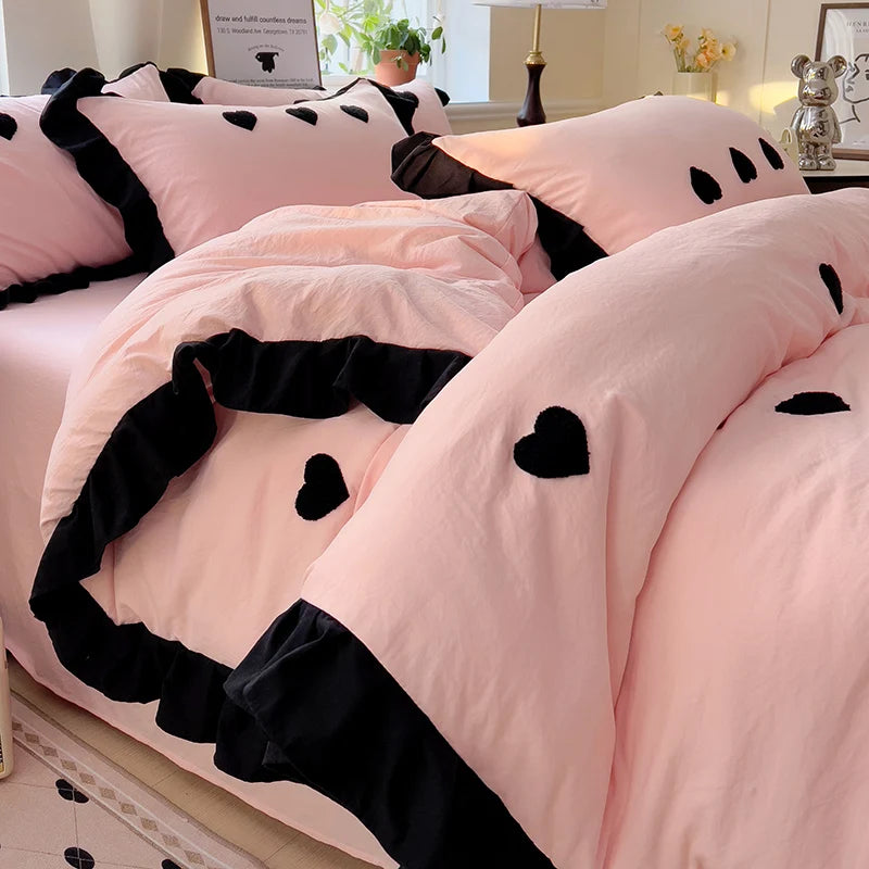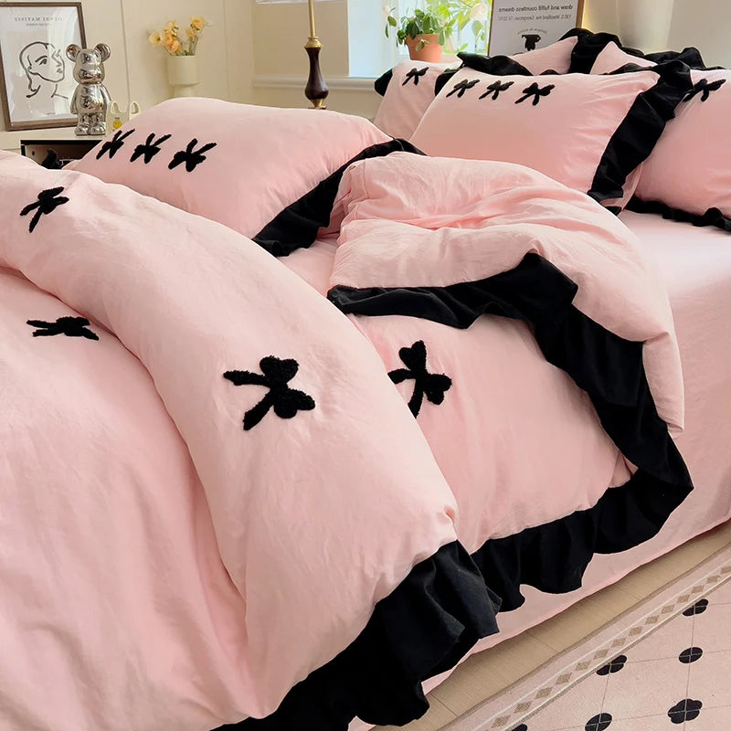 Soft, sassy, and sugar-sweet with a touch of edge, the Sweet Noir Bedding Set features bold black embroidery either tiny bows or hearts on a dreamy pink or cream base. With frilly black ruffle trim and plush polyester fabric, this set brings coquette core, romantic goth and kawaii luxe vibes into perfect harmony.