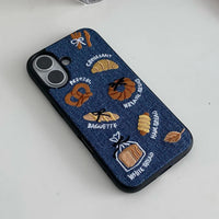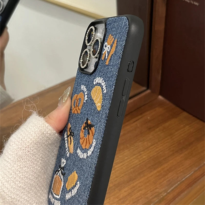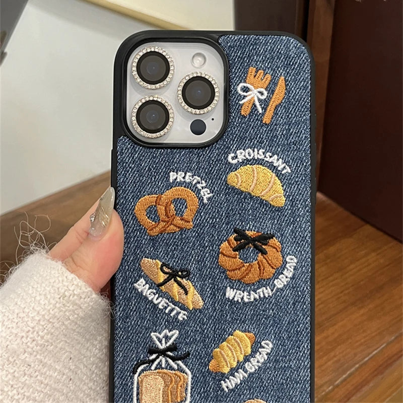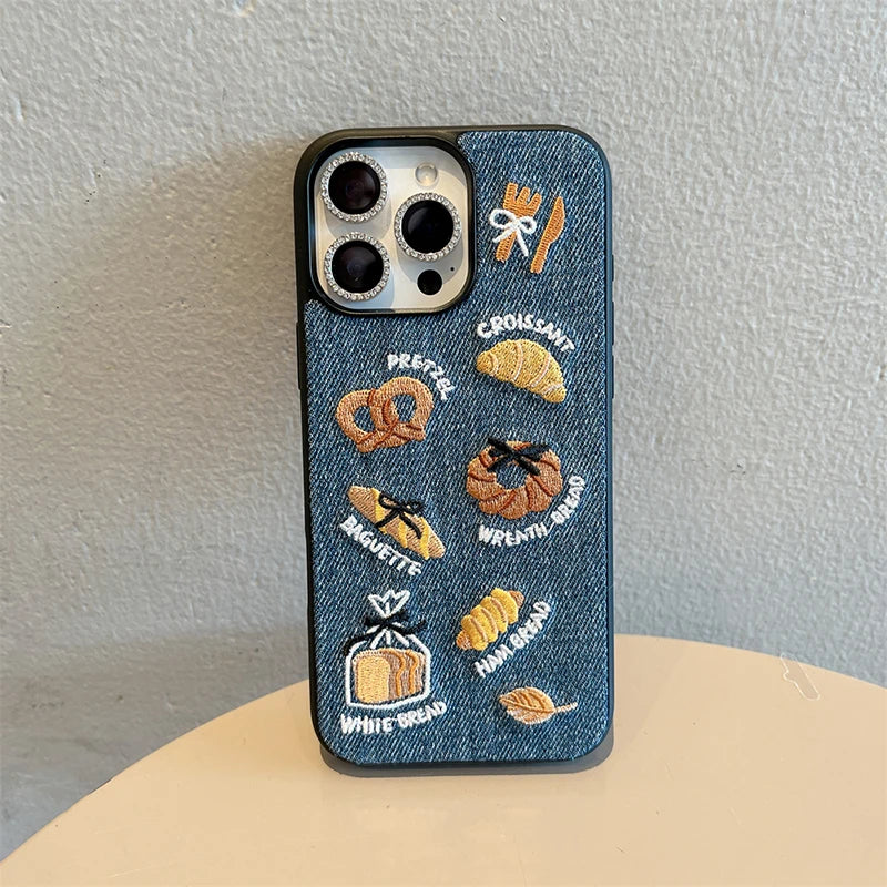 Handcrafted with meticulous attention to detail, each case features charming bread toast embroidery against a classic denim backdrop creating a textural wonderland that's as pleasing to touch as it is to behold. The raised embroidery creates a sensory experience that transforms every text, call, or scroll into a moment of tactile joy.